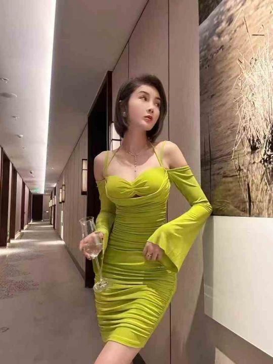 XULU原创纯色褶皱水晶麻纱时尚气质修身长袖拼接一字领吊带连衣裙,294条,S...