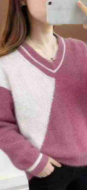 秋冬新款仿水貂绒V领套头洋气撞色设计感小众套头毛衣...