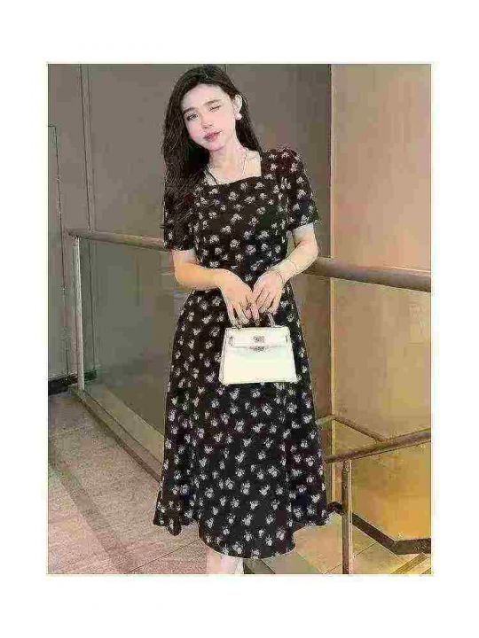 碎花裙女夏季新款女长款修身显瘦方领短袖小黑裙子法式...