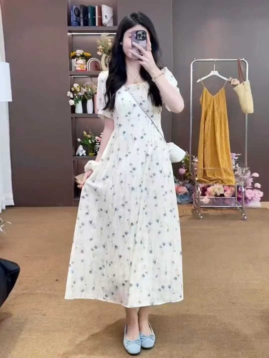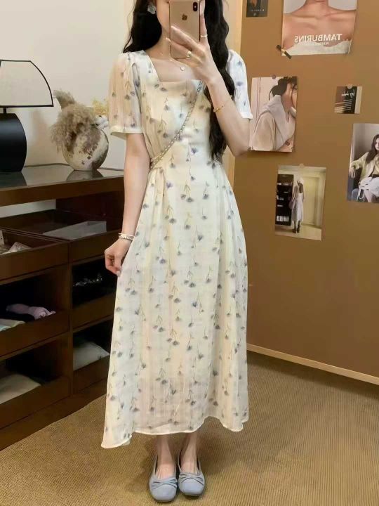 法式方领碎花连衣裙2025夏季新款收腰显瘦气质130件,...