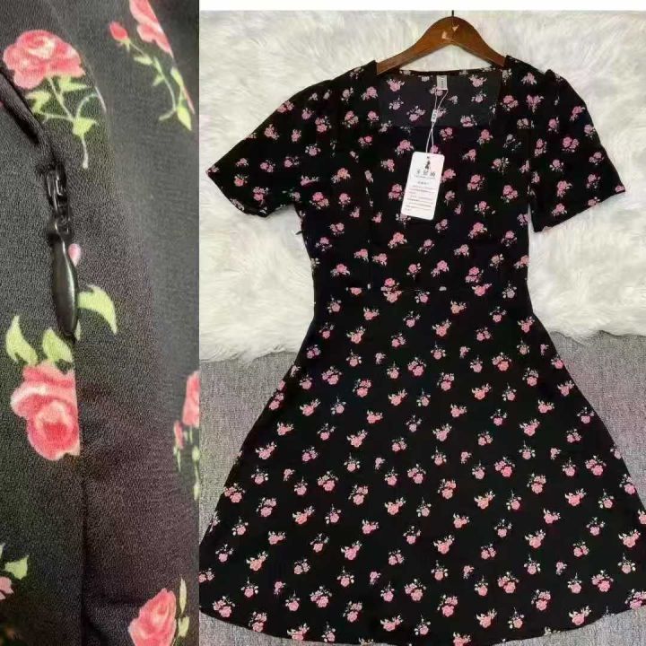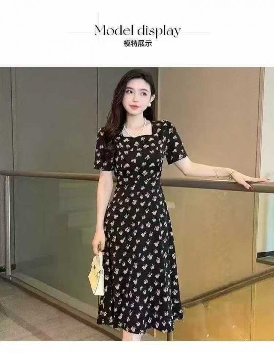 碎花裙女夏季新款女长款修身显瘦方领短袖小黑裙子法式收腰连衣裙260件,独立包装带吊牌,尺码S-3XL货品干净整洁,全清福利价12.8元