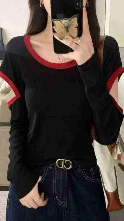 春秋网红新款撞色拼接漏肩韩系长袖T桖,独立包装,码...