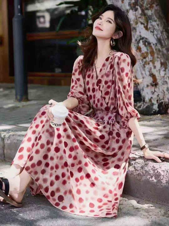 波点碎花连衣裙v领夏季2025新款法式高级感显瘦气质A字...