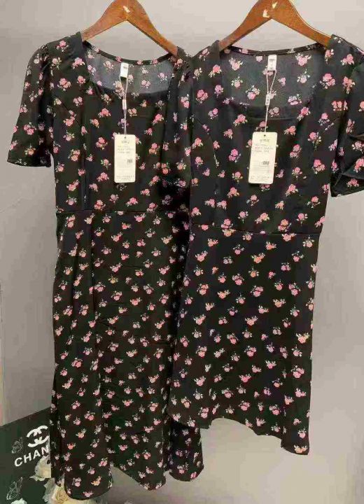 碎花裙女夏季新款女长款修身显瘦方领短袖小黑裙子法式收腰连衣裙260件,独立包装带吊牌,尺码S-3XL货品干净整洁,全清福利价12.8元