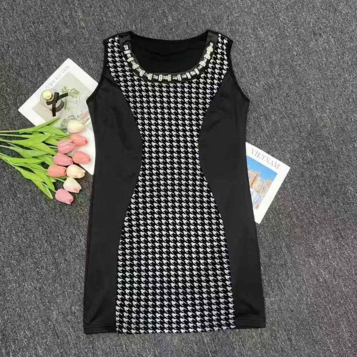 夏季新款立体剪裁拼接撞色带镶钻千鸟格修身圆领女士无袖背心连衣裙 独立包装带吊牌 数量850件 码数XL-3XL 全清5.5 分货加0.5