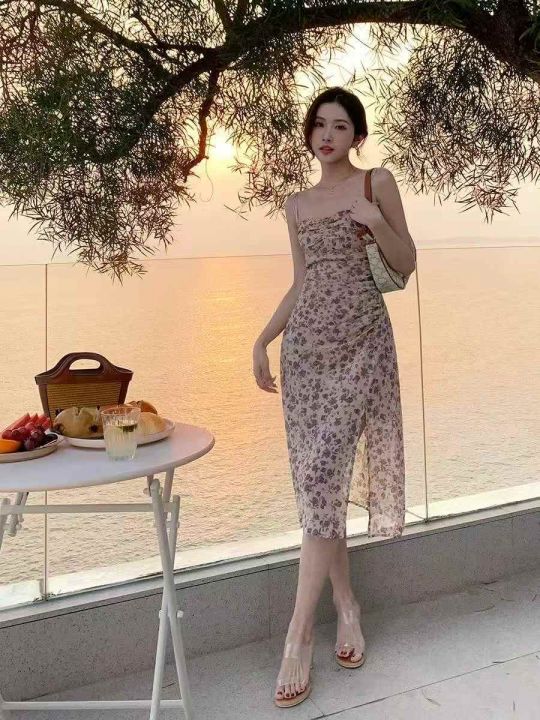 夏季新款复古网红设计款开叉法式浪漫性感吊带雪纺碎花连衣裙,独立包装,码...
