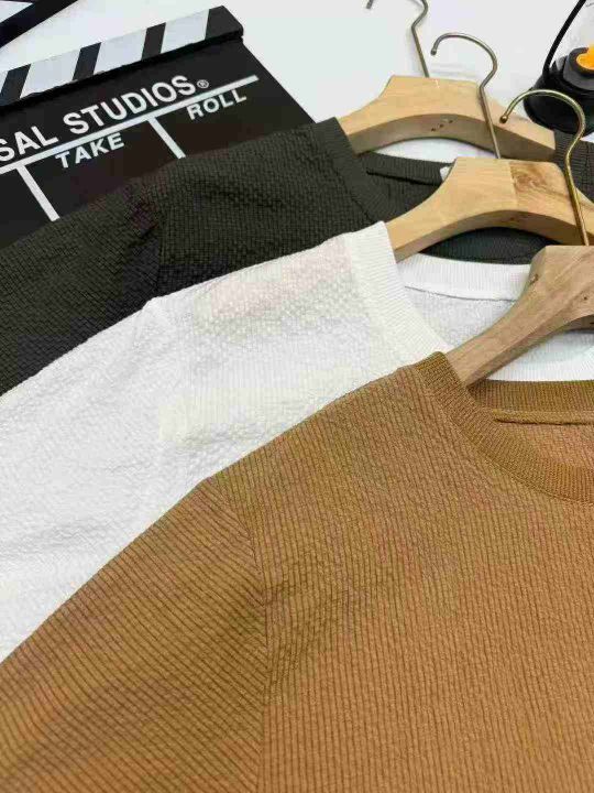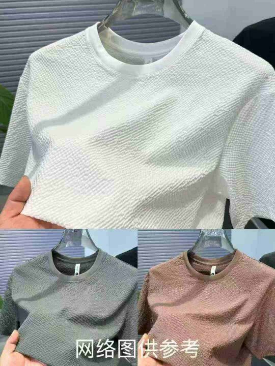 男士潮流短袖T恤,采用细微凹凸肌理的特殊面料,面料柔软有立体感,数量463件,码数M-4XL,单款3色,独立包装