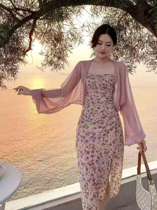 夏季新款复古网红设计款开叉法式浪漫性感吊带雪纺碎花连衣裙,独立包装,码...