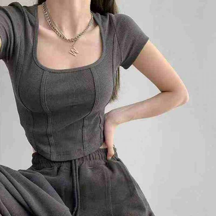夏季新款辣妹纯欲鱼骨u领正肩弹力修身短袖T桖,独立包...