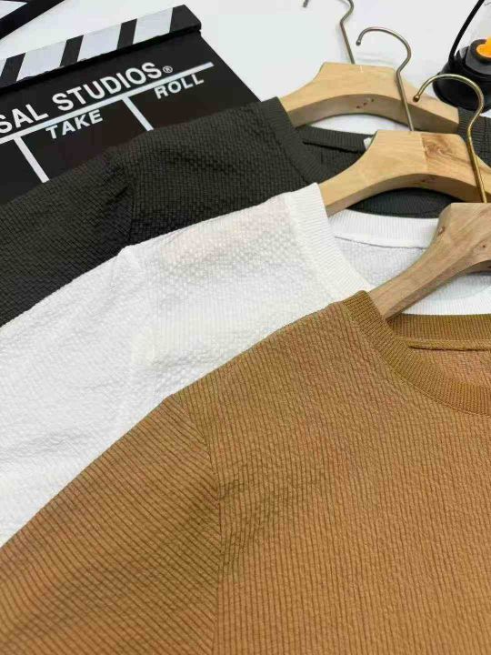 男士潮流短袖T恤,采用细微凹凸肌理的特殊面料,面料柔软有立体感,数量463件,码数M-4XL,单款3色,独立包装