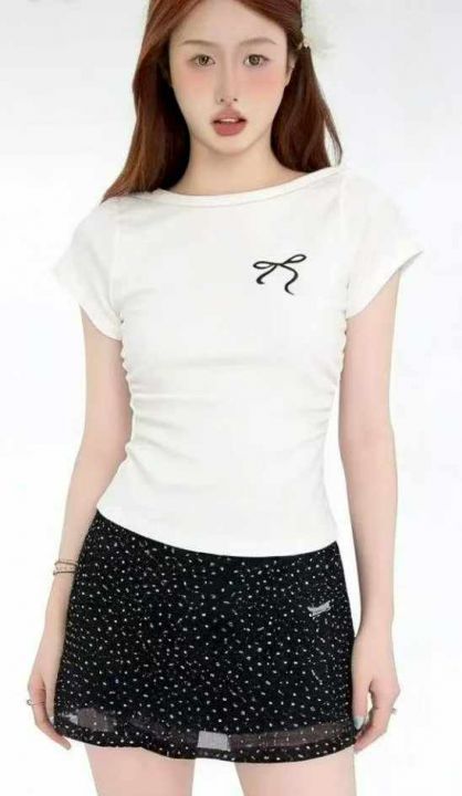 夏季新款美式纯欲辣妹气质正肩印花弹力棉短袖T恤,独立包装,码数1-4码, 5...