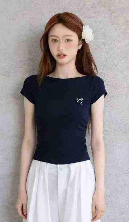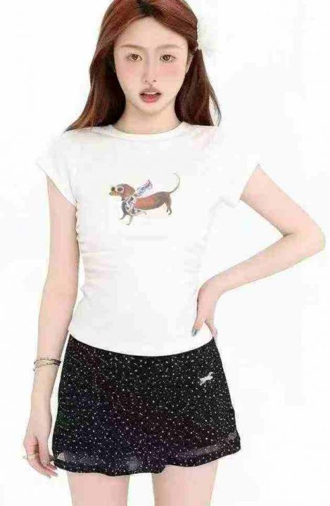 夏季新款美式纯欲辣妹气质正肩印花弹力棉短袖T恤,独...