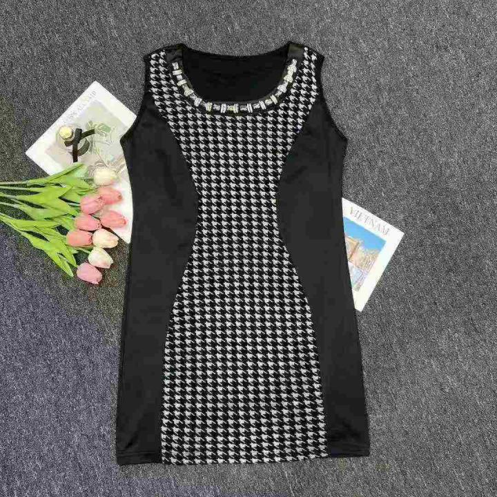 夏季新款立体剪裁拼接撞色带镶钻千鸟格修身圆领女士无袖背心连衣裙 独立包装带吊牌 数量850件 码数XL-3XL 全清5.5 分货加0.5