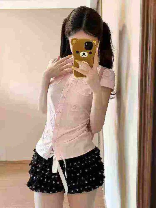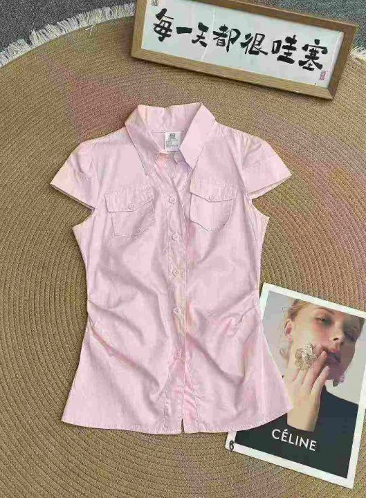 韩系设计感短袖衬衫276件8.5,褶皱收腰,后领包边,码...