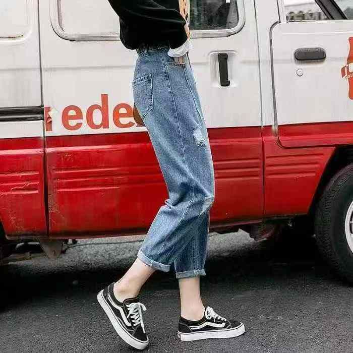 夏季破洞牛仔裤女宽松显瘦哈伦九分裤松紧腰大码老爹裤...