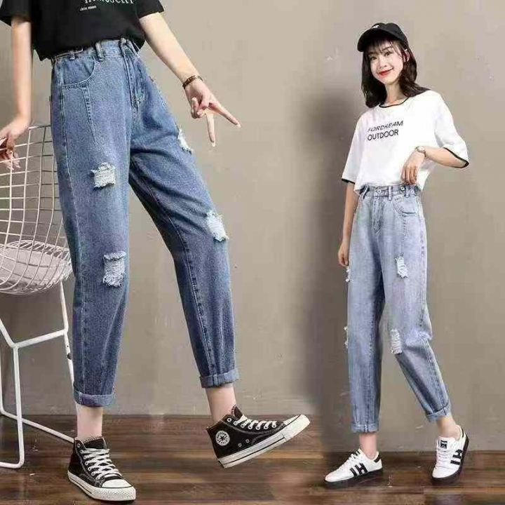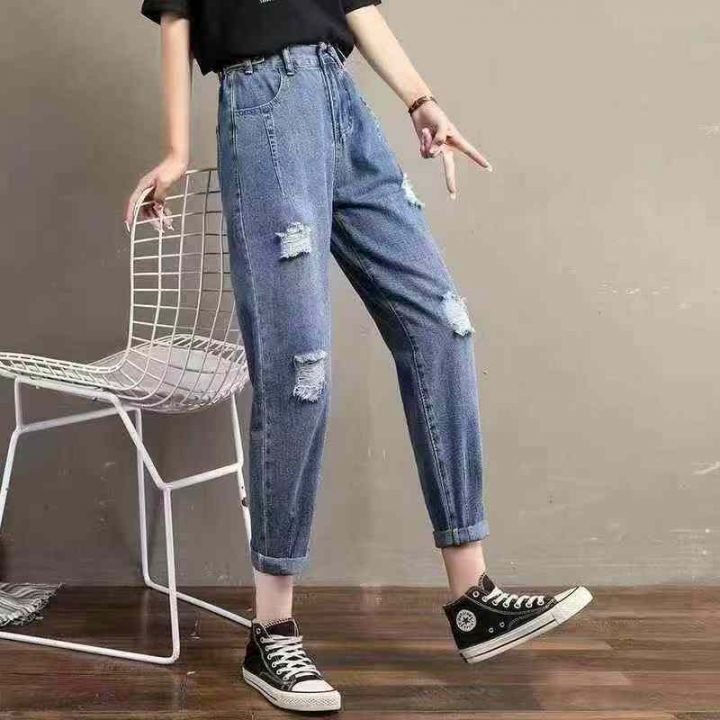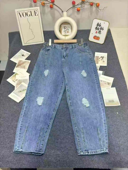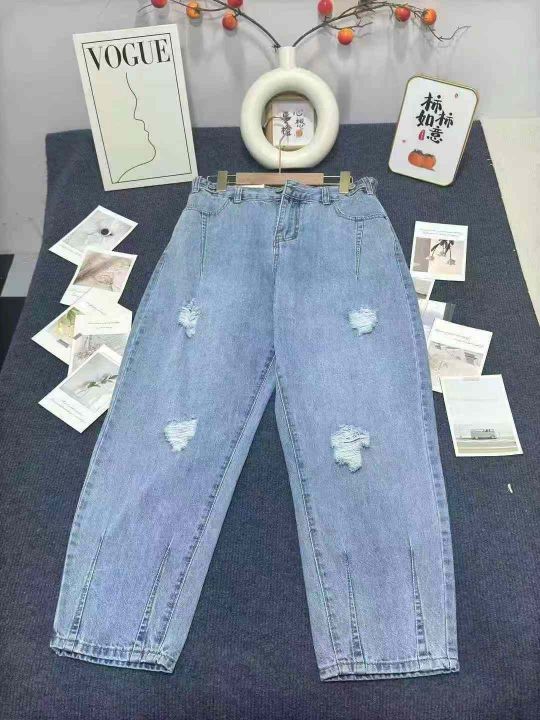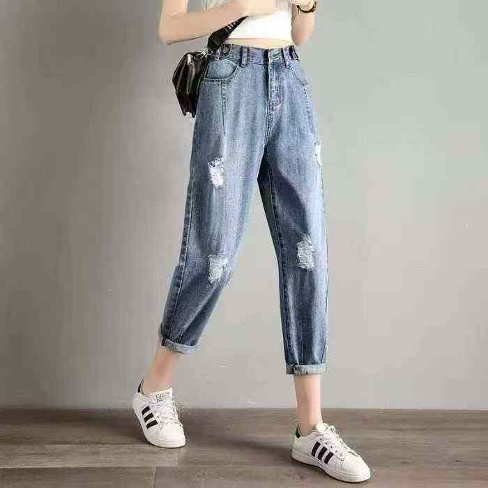 夏季破洞牛仔裤女宽松显瘦哈伦九分裤松紧腰大码老爹裤,数量330件,码数M-2XL,独立包装,全清11.8元