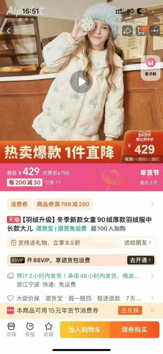 [啤酒]③巴拉女童巴重工艺羽绒服加厚儿童外套,独立包...