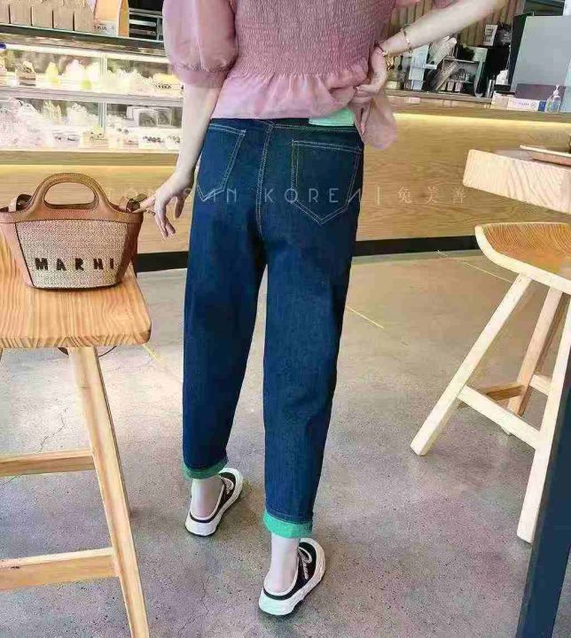 韩国代购女装 弹力牛仔蓝绿色翻边裤脚老爹牛仔裤228件,独立包装带吊牌,尺码L~4XL,全清福利价9.9元分货➕1