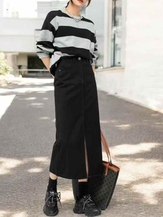 靓妹黑色牛仔半身裙女新款直筒开叉长裙子145件,独立包装带吊牌,尺码S~5XL全清独立包装9.8元