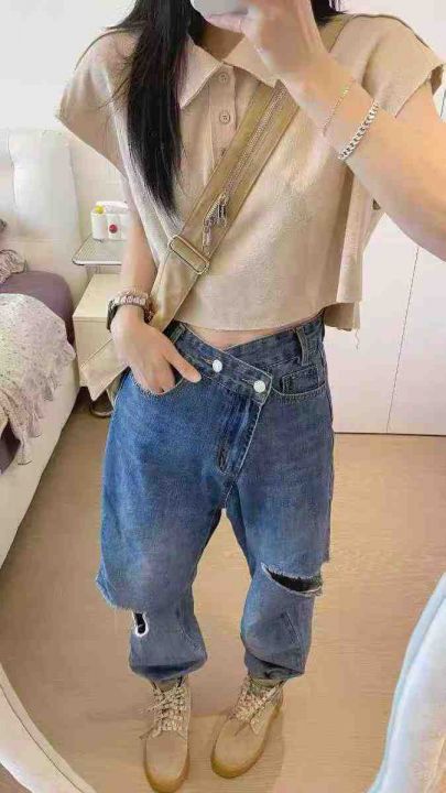 [月亮]:13.8清273件[月亮]:斜扣破洞潮流直筒软面料牛仔裤[月亮]:SML,独...