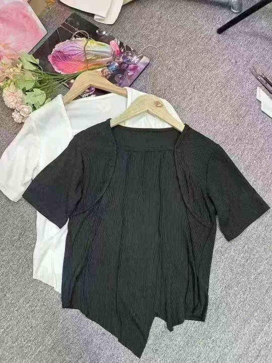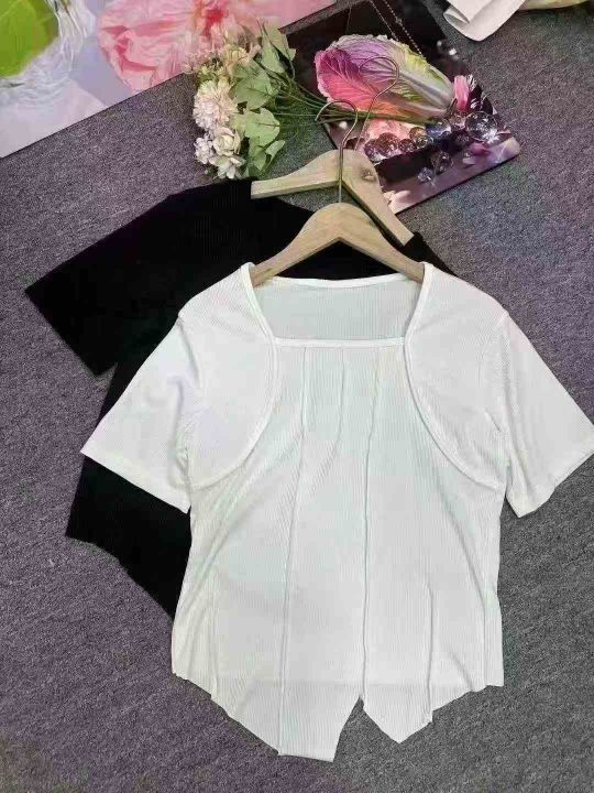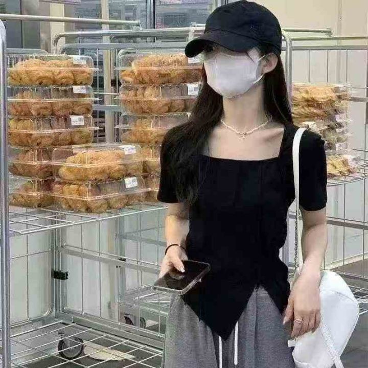 冰丝螺纹纯欲方领短袖t恤女2025夏季修身chic别致独特甜辣妹正肩短款上衣,1到6码,独立包装,货品干净,1000件左右,5.8清,分货加1