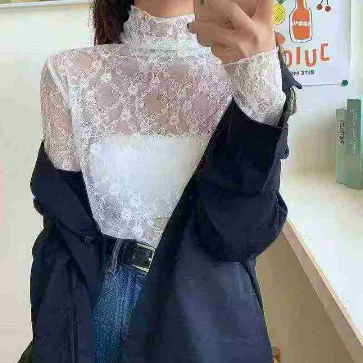 1300件半高领木耳边蕾丝打底衫女玫瑰花法式网纱内搭别...