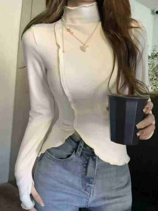 秋冬装螺纹德绒半高领T恤女设计感木耳边修身不规则百搭打底衫上衣潮,整款2色,面料软糯,弹力超大,独立包装,货品干净,1到4码,1150件左右,7.8清,分货加1