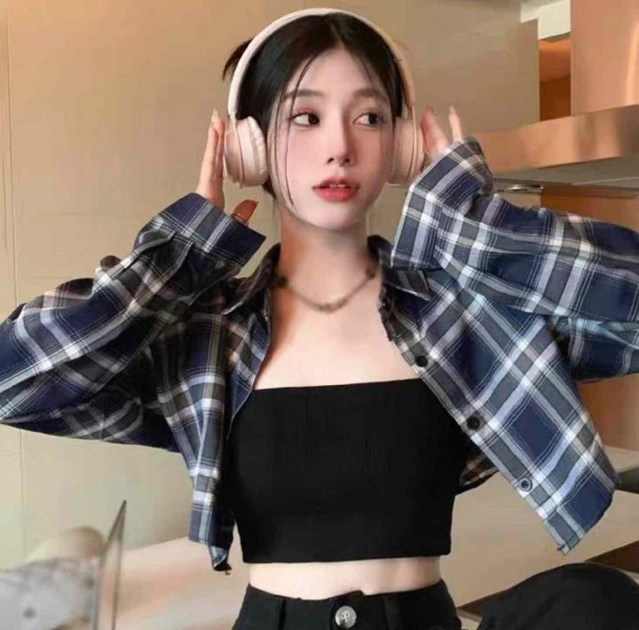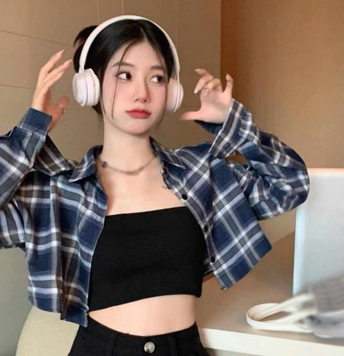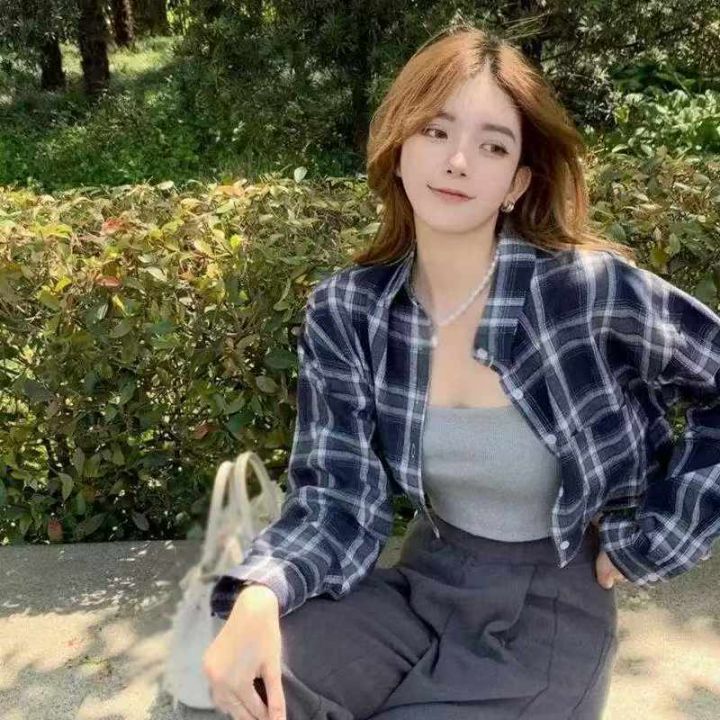 春季新款港味复古短款宽松百搭格子长袖衬衫外套,独立...