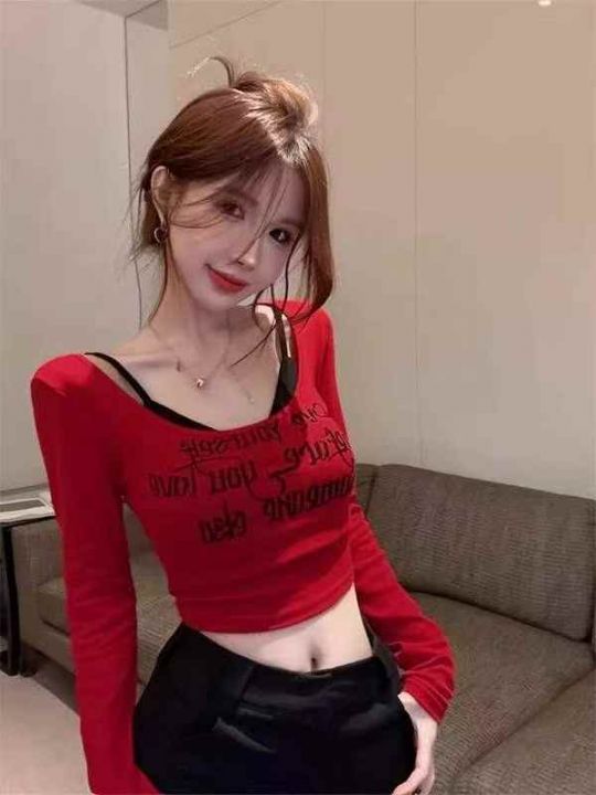 春季新款纯欲辣妹U领性感美式独特小众弹力修身短款长...