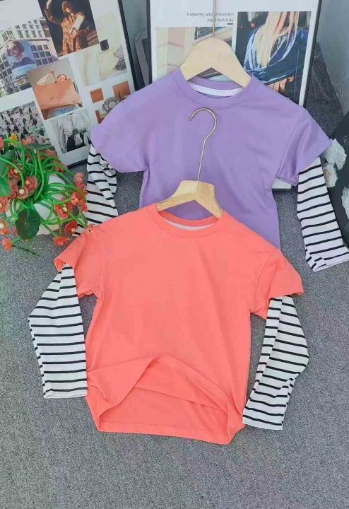 418件童装拼接袖打底衣,码数90~150码,10件一包装,单款两色。