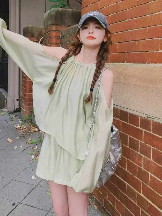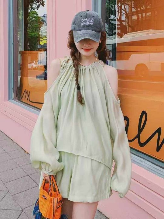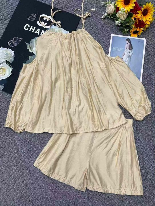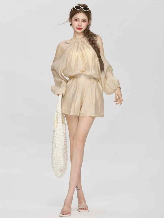 夏季新款法式高级感气质露肩时尚棉绸衬衣+棉绸短裤,...