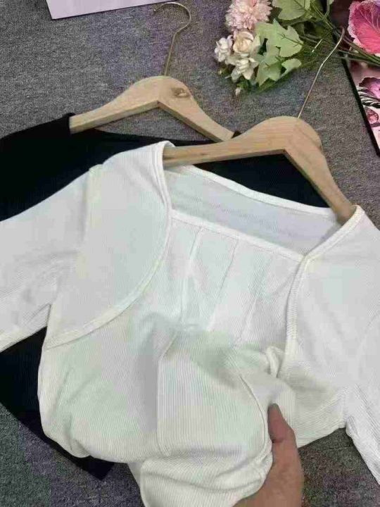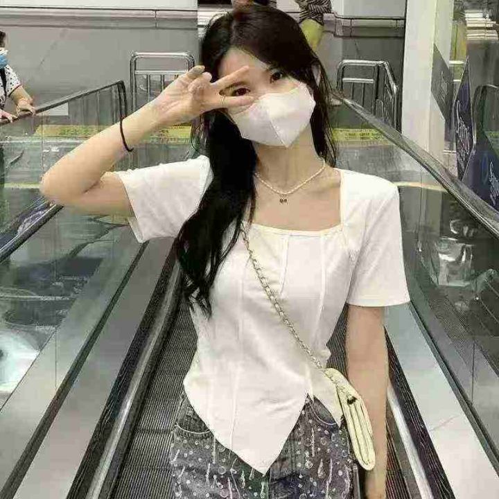 冰丝螺纹纯欲方领短袖t恤女2025夏季修身chic别致独特甜辣妹正肩短款上衣,1到6码,独立包装,货品干净,1000件左右,5.8清,分货加1