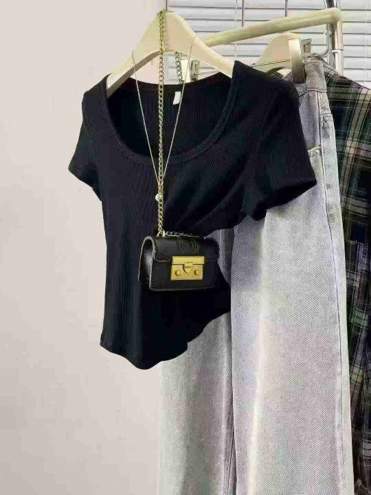 辣妹短袖T恤夏季正肩新款修身显瘦短款上衣,独立包装...