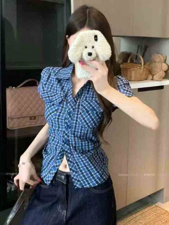 韩系设计感短袖衬衫276件8.5,褶皱收腰,后领包边,码...