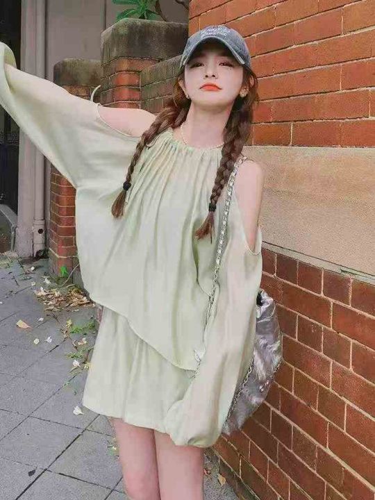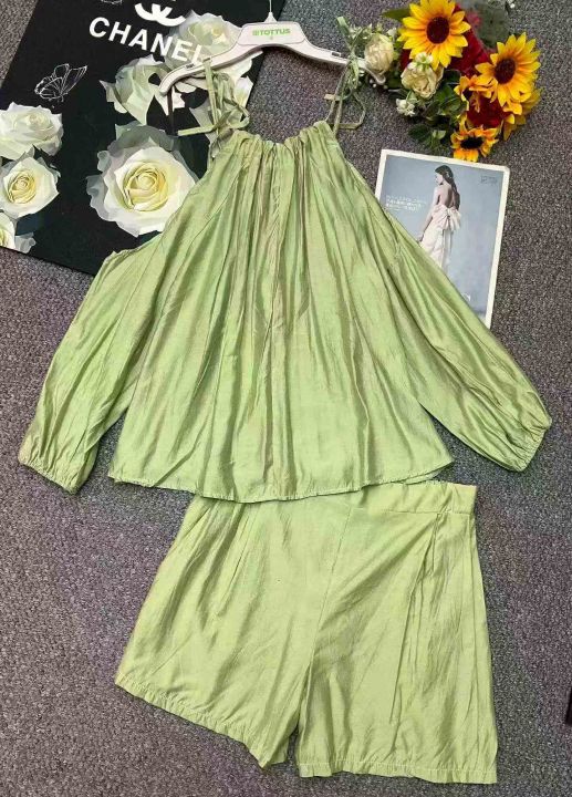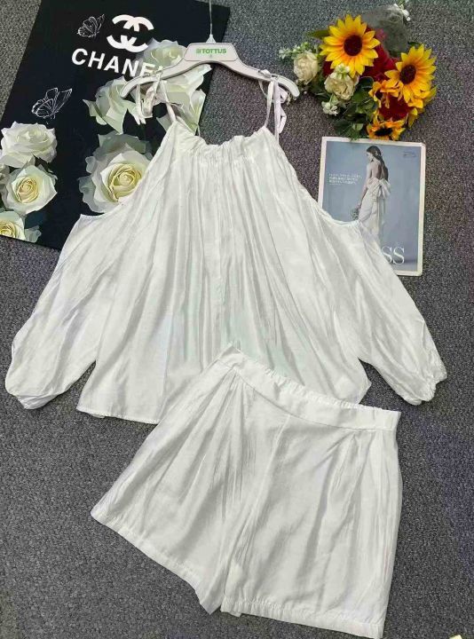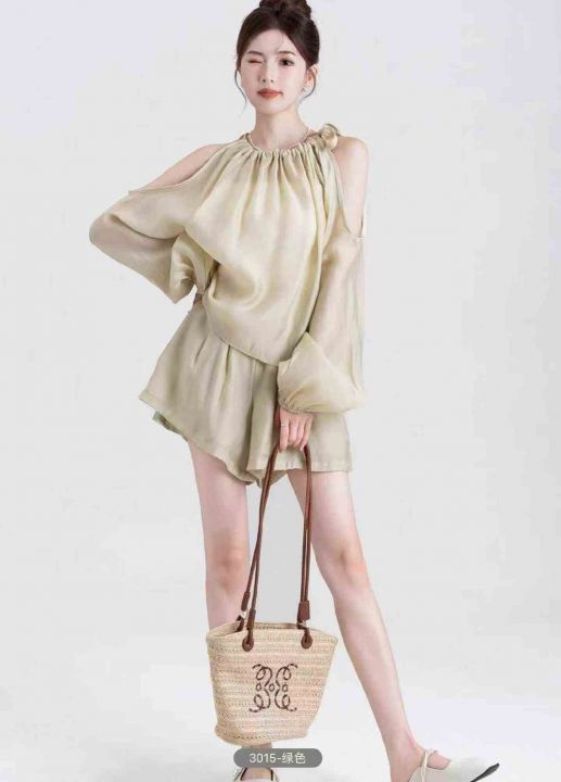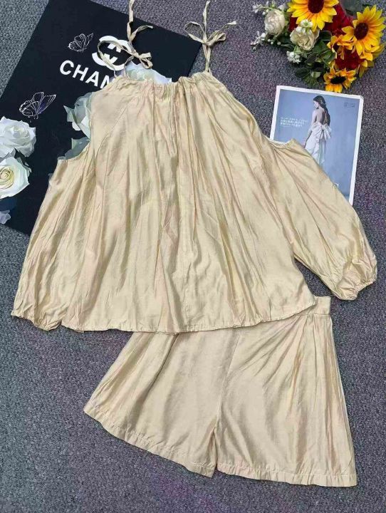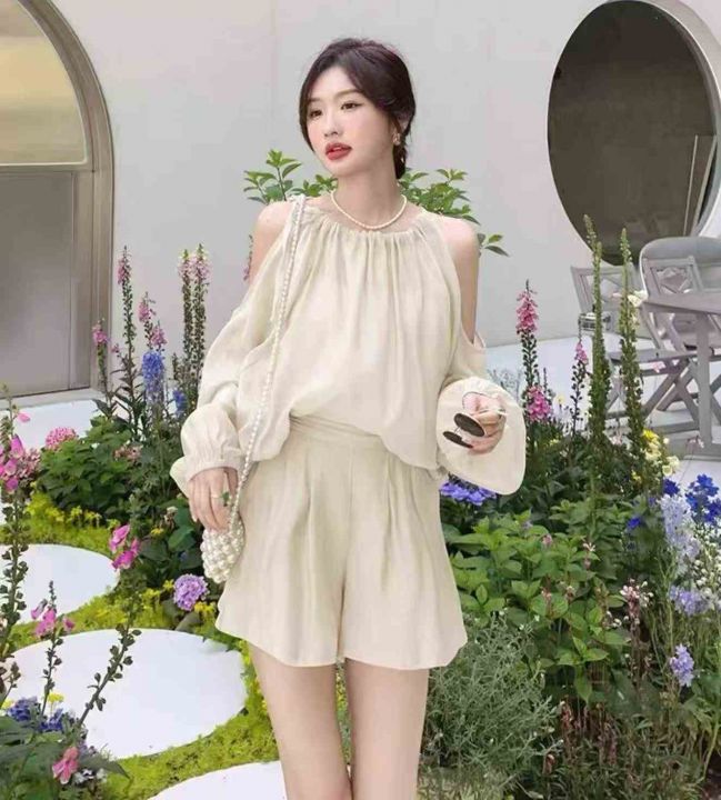 夏季新款法式高级感气质露肩时尚棉绸衬衣+棉绸短裤,...