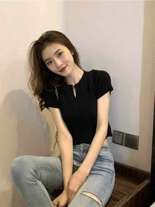 夏季新韩版版百搭弹力修身半开领小心机短袖针织T桖,独立包装,均码面料柔...