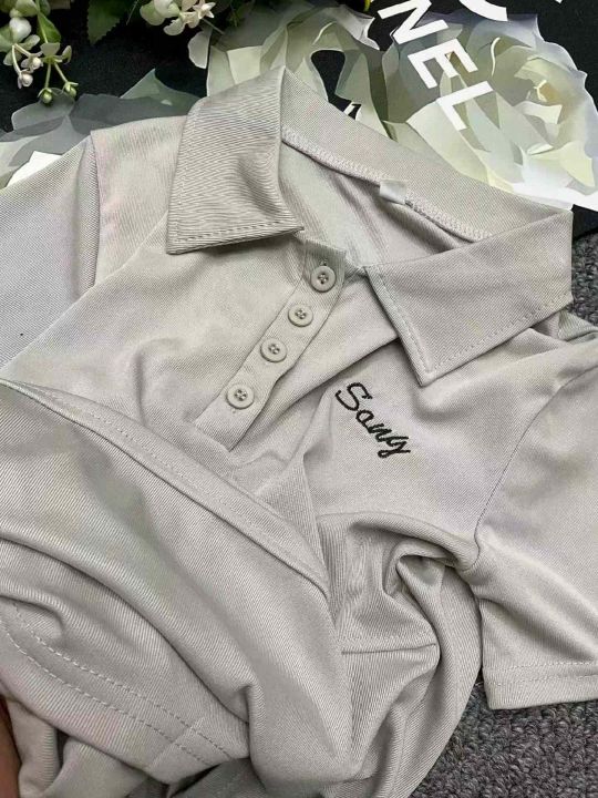 夏季新款美式学院风辣妹小众冰丝弹力修身显瘦polo领短...