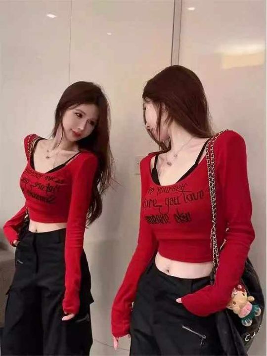 春季新款纯欲辣妹U领性感美式独特小众弹力修身短款长...