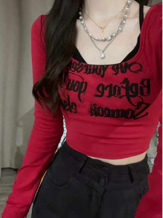 春季新款纯欲辣妹U领性感美式独特小众弹力修身短款长...
