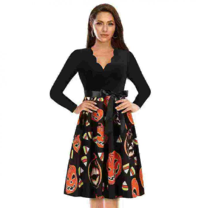 腾仓库,亏本清仓840件性感V领长袖黑色拼接印花大摆裙...