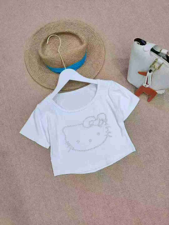 [月亮]:猫咪烫钻洋气短款气质辣妹短袖T恤