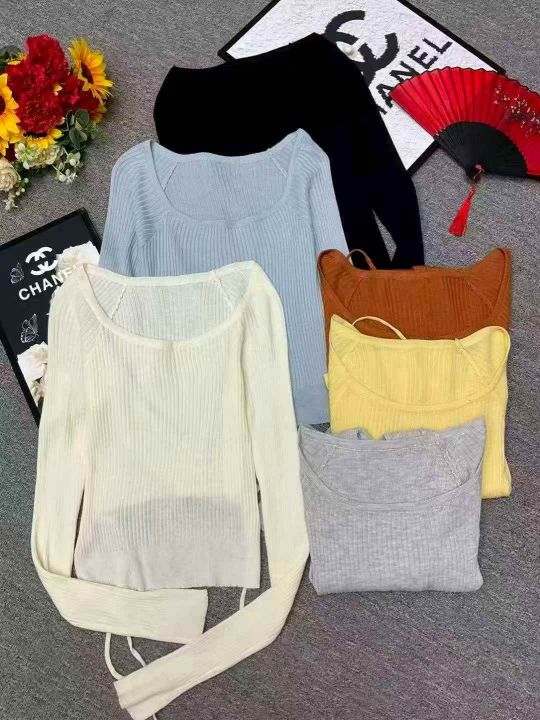 春秋新款法式方领前长后短腰间系带设计感后背露腰短款长袖针织羊毛衫,独立...