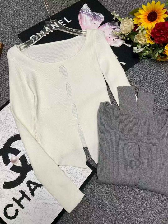 春秋新款纯欲风性感镂空弹力修身显瘦开叉针织套头毛衣...