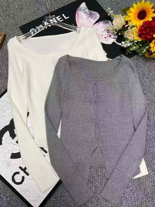 春秋新款纯欲风性感镂空弹力修身显瘦开叉针织套头毛衣...