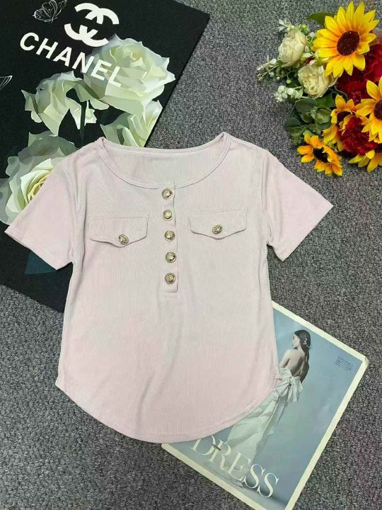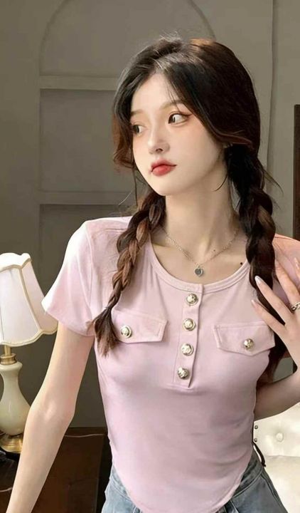 夏季新款时尚气质纯欲不规则弹力修身显瘦短款洋气纽扣圆领短袖t恤,独立包装,码数S-XL码, 245件左右,全清4.9元超低价秒杀!分货加一!
