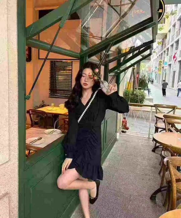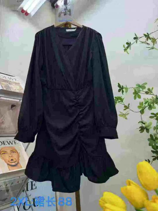 抽褶不规则连衣裙2025年秋季新款遮肚显瘦v领长袖裙,142条,码数:M-2XL,独立包装,(款号:0609#17)