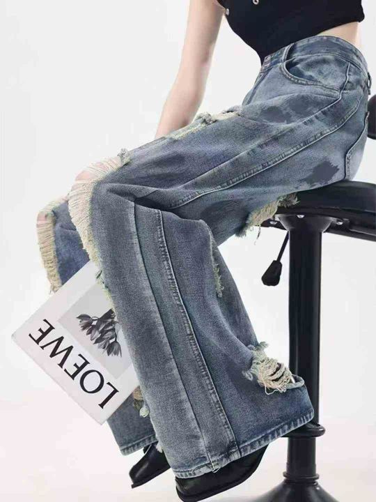 复古扎染废土风破洞女牛仔裤水洗垂感阔腿拖地裤,码数S-XXL,面料舒服柔软...