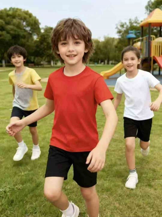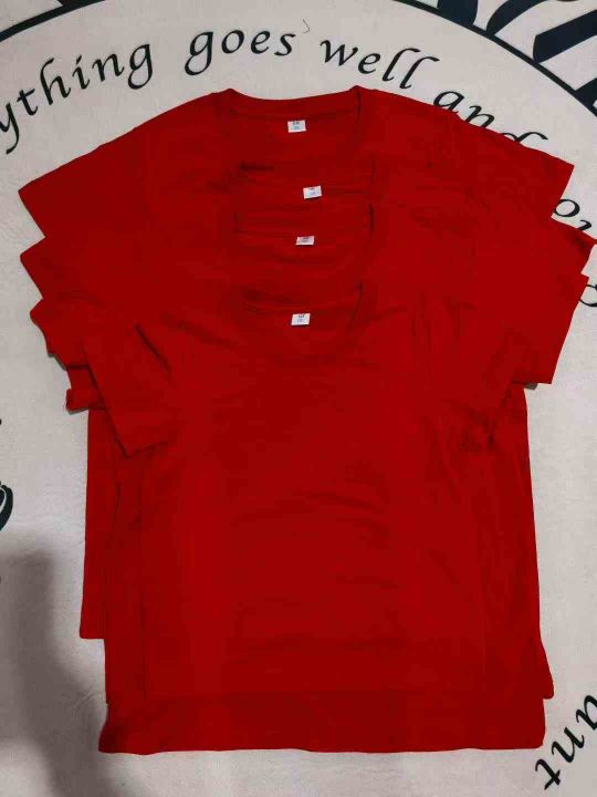 童装红色纯棉光板短袖T恤,数量564件,尺码110--160,后领包边到肩,十件一包装,有码数清单,大货干净整洁