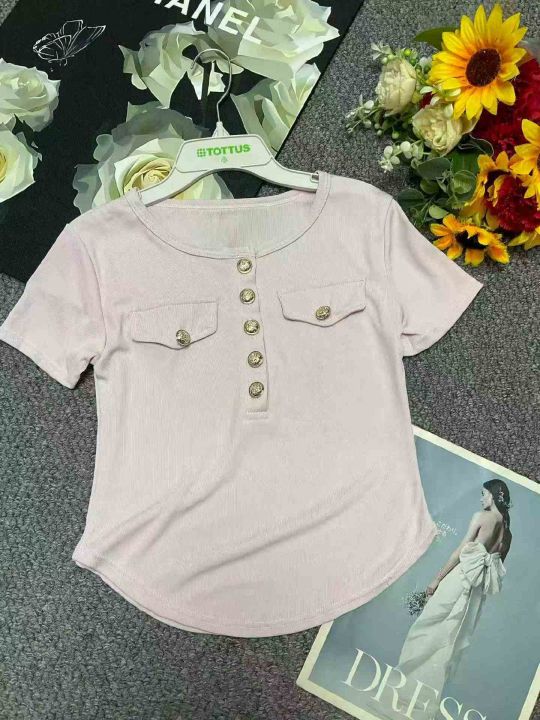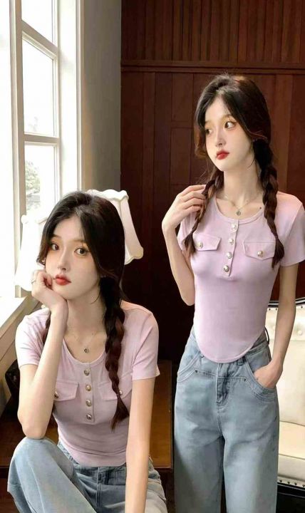夏季新款时尚气质纯欲不规则弹力修身显瘦短款洋气纽扣圆领短袖t恤,独立包装,码数S-XL码, 245件左右,全清4.9元超低价秒杀!分货加一!