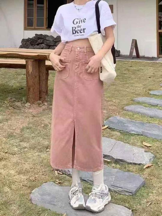 早秋新款高品质网红爆款洗水棉显瘦a字中长款开叉牛仔半身长裙,独立包装带...